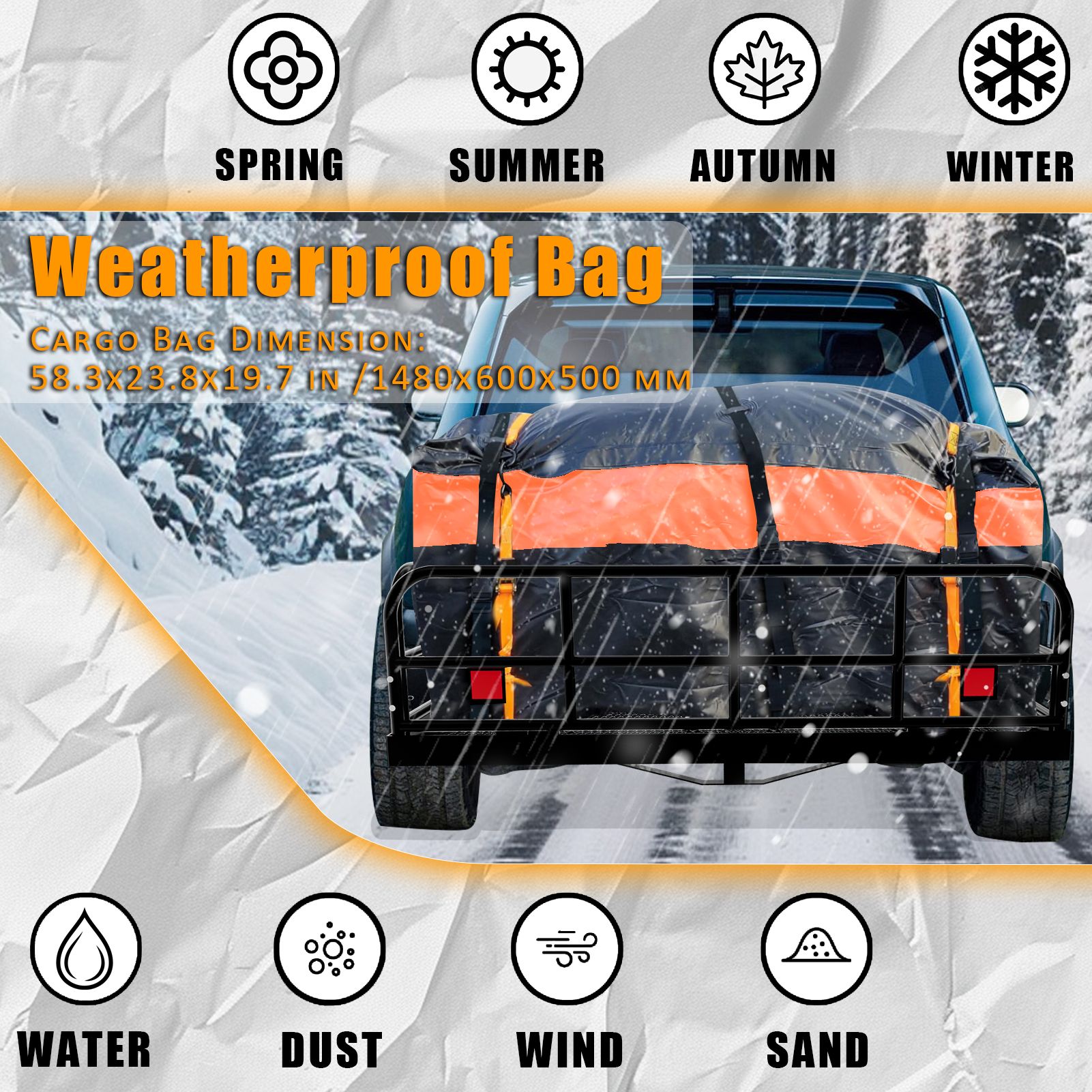 3.Practical Accessories:Considering your needs, we have prepared vehicle cargo carrier’s complete accessories for you. A large capacity waterproof cargo bag protects your luggage from rain and snow, cargo net holds the luggage bag together with tow hitch cargo carrier, and a lock of cargo cart for hitch with wheels ensures the safety of your luggage